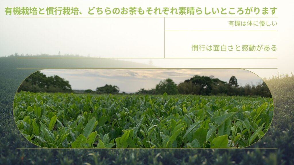 有機栽培と慣行栽培、どちらのお茶もそれぞれ素晴らしいところがります