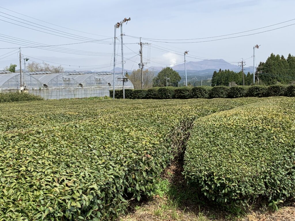 茶園は宮崎県の高千穂にあり、遠くに阿蘇山が見えるとてもきれいな場所でした。