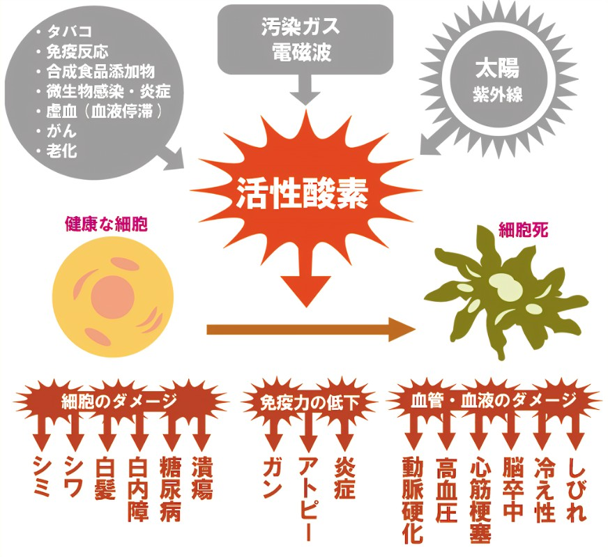 活性酸素は本来【侵入異物(病原微生物)の除去】【不要な細胞の処理】など、生態の調整機能として備わっていますが、増えすぎると正常な細胞や遺伝子を攻撃し始めます。
